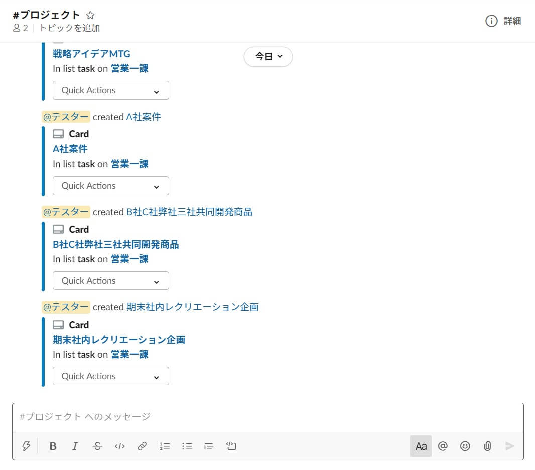 このチャンネルでタスクを共有することで、だれが何を行っているのか可視化しやすくなります。