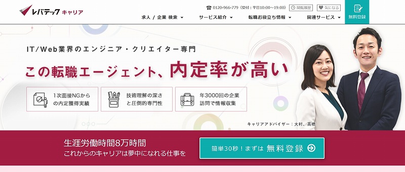 レバテックキャリアは、エンジニアの実務経験豊富なキャリアコンサルタントからのサポート・サービスを受けられる転職エージェントです。
